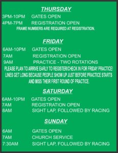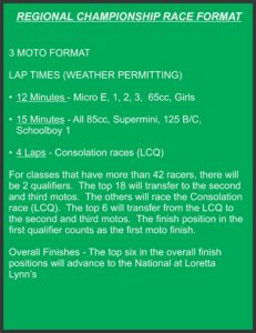 • There will be qualifiers in some classes at the Regional. For classes that have more than 42 in the class, we will run two qualifiers and one LCQ for these classes. The qualifiers count as your first moto finish. (See Loretta’s Supplemental Rules for more info.)